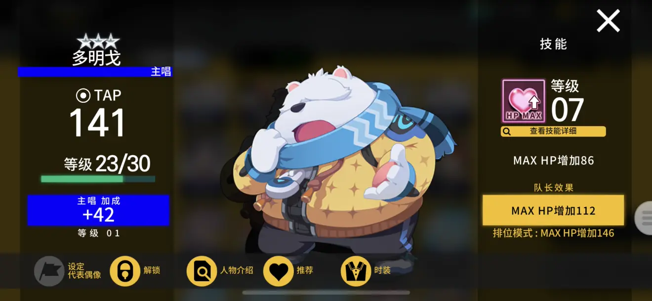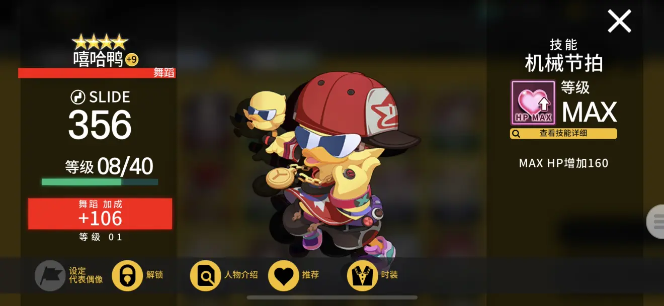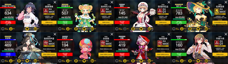 另外,之前说到的可练可不练,练了最好的1★梦琪。其作用是当你SLIDE位置没有加固定分偶像的时候,可以SLIDE位置上梦琪,TAP位置换成加分的卡。同理,FLICK位置也可以用其他分卡来替换,这个时候你如果有梦琪,挂机组合的搭配就会更加的灵活和多元。可能有人要问,这样那我就没有蜂蜂加血了。这好办,你SLIDE练个嘻哈鸭,或者TAP练一个多明戈(那只白熊)就可以了,加的HP也不老少,足够你全MISS撑过绝大部分的简单~困难,及部分专家歌曲。